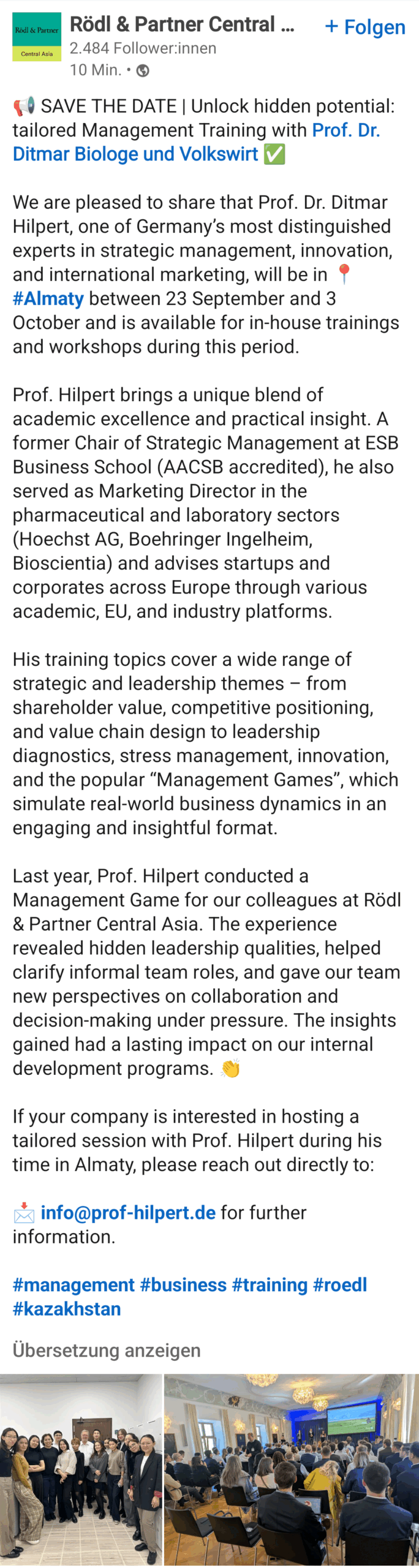 Die weltweite renommierte Unternehmensberatung Rödl&Partner veröffentlicht am 9.9.2025 auf Ihrer LinkedIn-Seite Zentralasien Folgendes:
